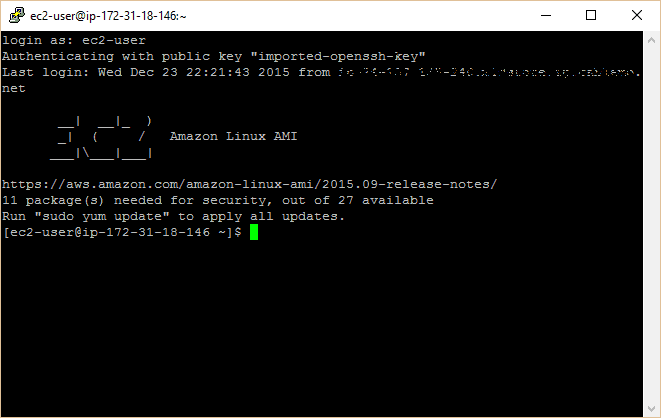 - A prompt will appear asking you for a username. This differs based on what type of server you set up at the beginning. For the Amazon Linux AMI, it’s “ec2-user”.