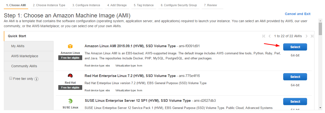 - Choose whatever Linux AMI is listed as “free tier eligible.” At the time of writing this article, that’s the Amazon Linux AMI. Go on to the next step.