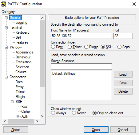 - Now close out of PuTTygen and open PuTTy. Copy your instance’s public IP from the EC2 console into PuTTy. Type in a name for your session and hit save.