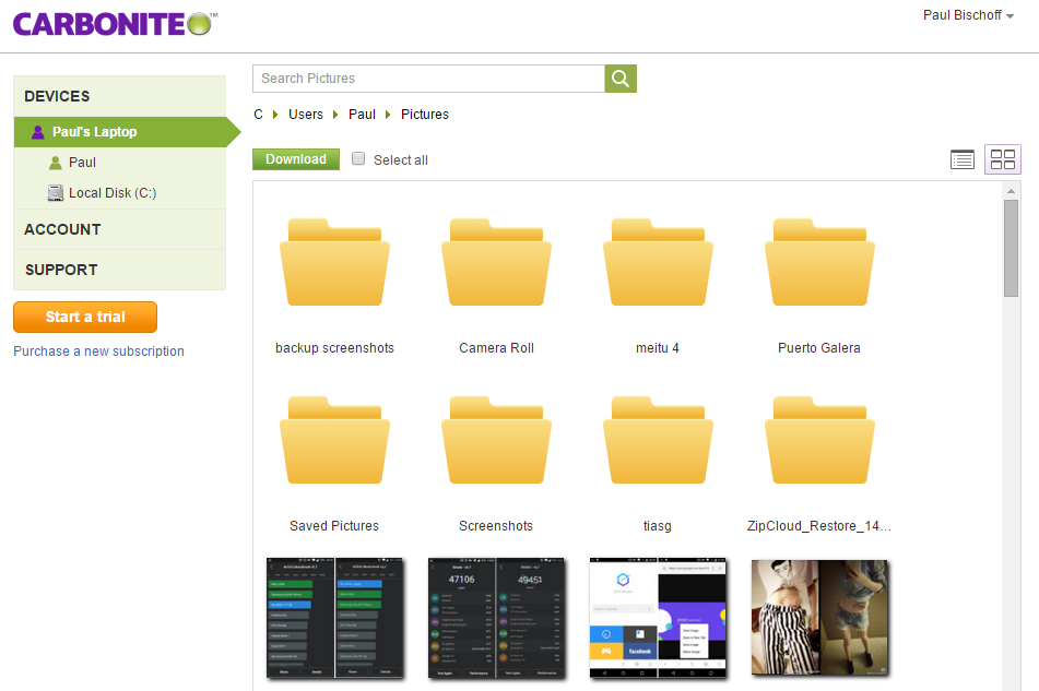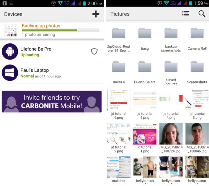 Carbonite’s mobile app fares better in both design and features. You get access to all the files backed up from your PC and can enable automatic photo and video backup, which is fairly par for the course. There’s not option to automatically backup contacts, calendars, SMS, or other media, however. The search function works fast and you can switch to a tile view to see thumbnails of photos. Currently the app is available for iOS and Android only.