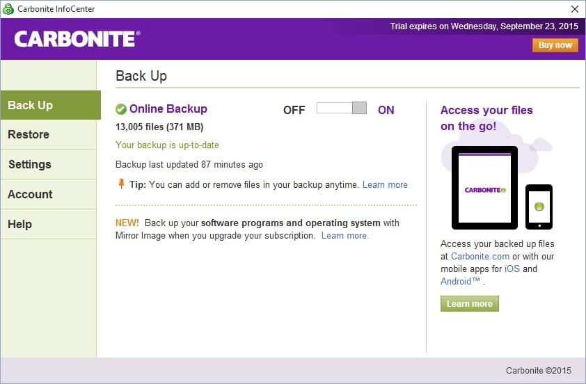 Carbonite offers a free trial of its Personal Basic plan for 15 days, no credit card required.