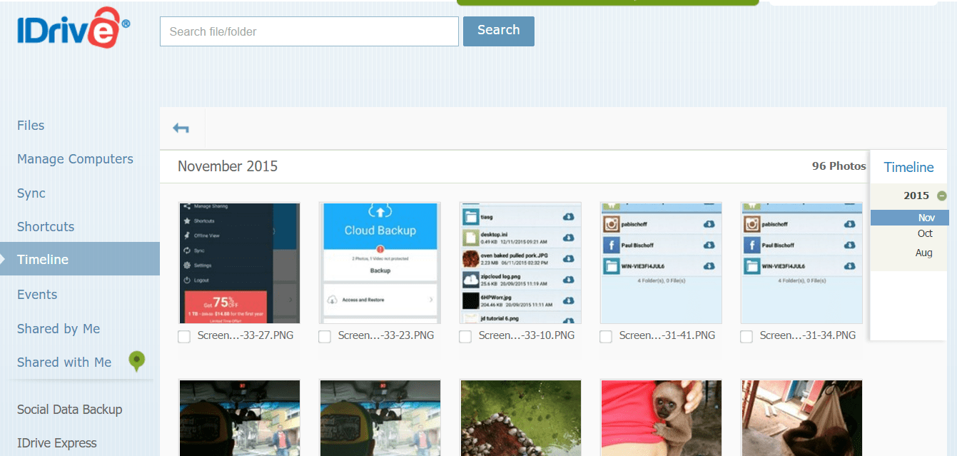 The web app includes a similar file explorer for navigating and restoring files. It can be used to restore files on your desktop remotely from another device. The web app is where you’ll manage devices and shared files. It includes a timeline of all the photos uploaded from all your devices in chronological order. From here you can also perform social media backups.